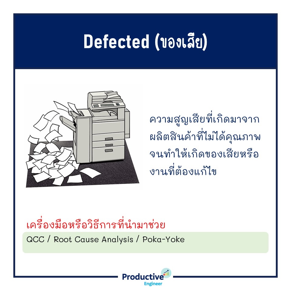 📌Defected (ของเสีย) – ความสูญเสียที่เกิดมาจากผลิตสินค้าที่ไม่ได้คุณภาพจนทำให้เกิดของเสียหรืองานที่ต้องแก้ไข.