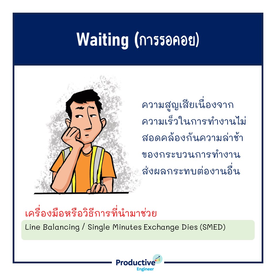 📌Waiting (การรอคอย) – ความสูญเสียเนื่องจากความเร็วในการทำงานไม่สอดคล้องกันความล่าช้าของกระบวนการทำงาน ส่งผลกระทบต่องานอื่น