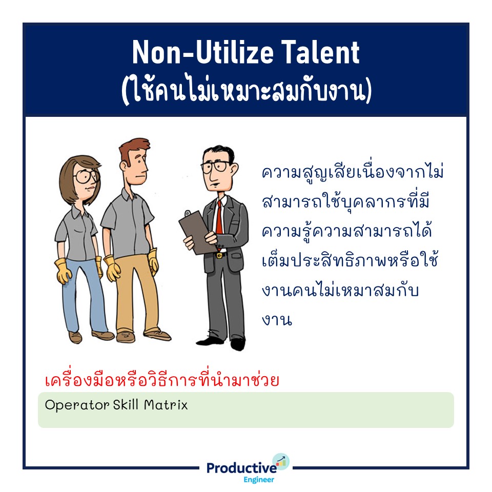 📌Non-Utilize Talent (ใช้คนไม่เหมาะสมกับงาน) – ความสูญเสียเนื่องจากไม่สามารถใช้บุคลากรที่มีความรู้ความสามารถได้เต็มประสิทธิภาพหรือใช้งานคนไม่เหมาสมกับงาน