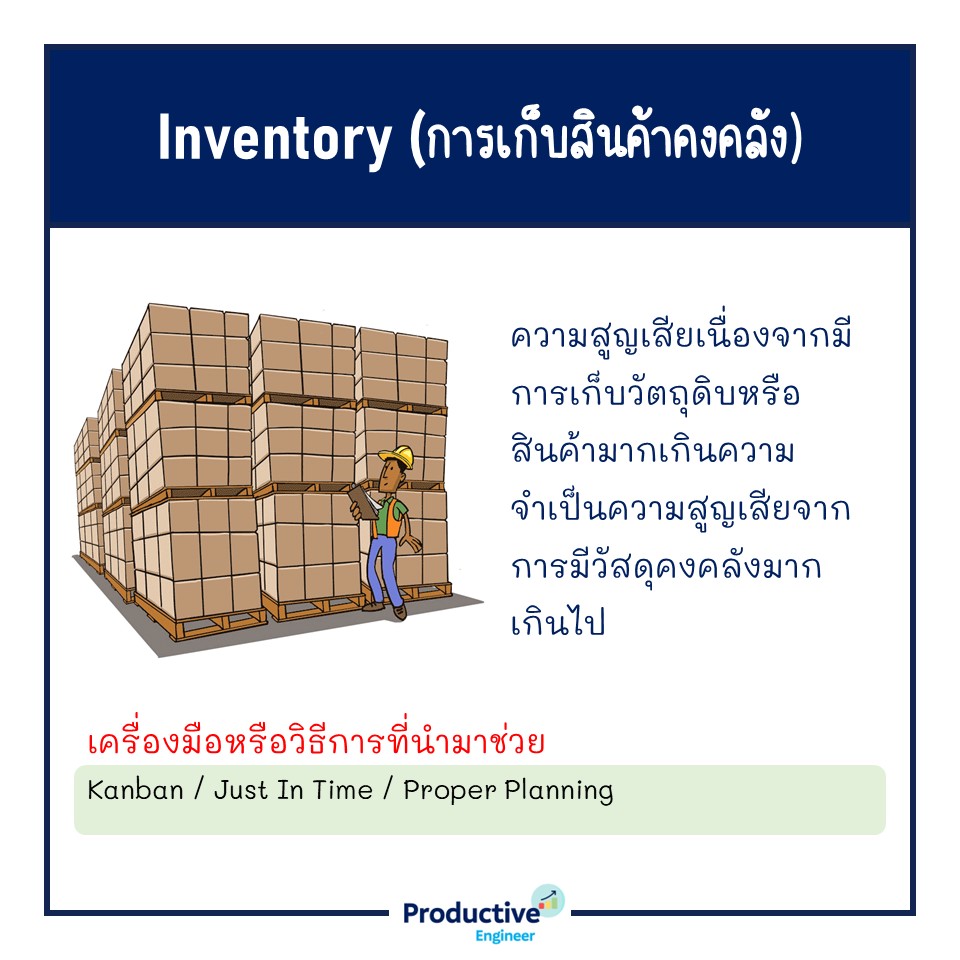 📌Inventory (การเก็บสินค้าคงคลัง) – ความสูญเสียเนื่องจากมีการเก็บวัตถุดิบหรือ สินค้ามากเกินความจำเป็นความสูญเสียจากการมีวัสดุคงคลังมากเกินไป