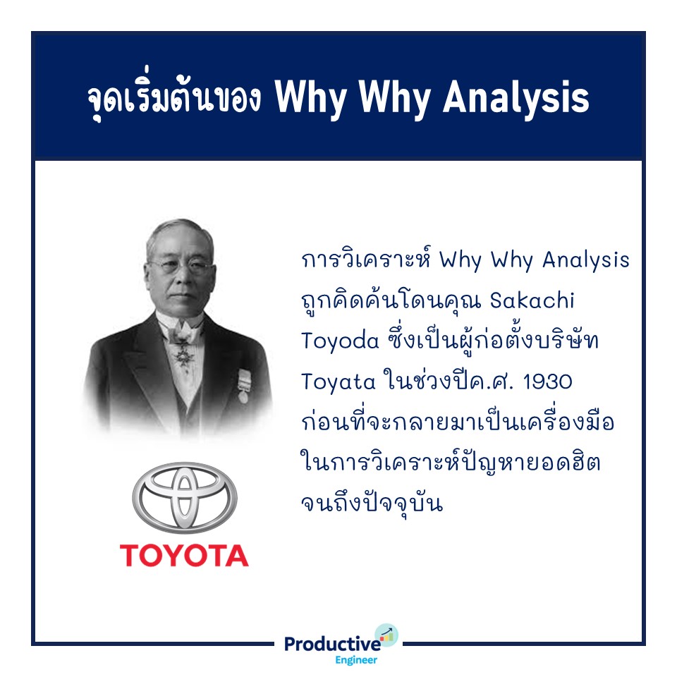 การวิเคราะห์ Why Why Analysis ถูกคิดค้นโดนคุณ Sakachi Toyoda ซึ่งเป็นผู้ก่อตั้งบริษัท Toyata ในช่วงปีค.ศ. 1930 ก่อนที่จะกลายมาเป็นเครื่องมือในการวิเคราะห์ปัญหายอดฮิตจนถึงปัจจุบัน