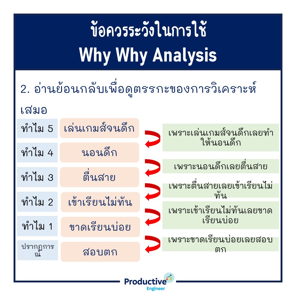 📌อ่านย้อนกลับเพื่อดูตรรกะของการวิเคราะห์ ว่าที่วิเคราะห์มาสมเหตุสมผลหรือไม่ โดยเริ่มจากทำไมที่5 ไปจนถึง ปรากฏการณ์ของปัญหา