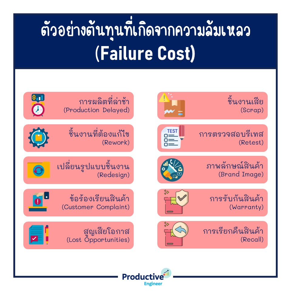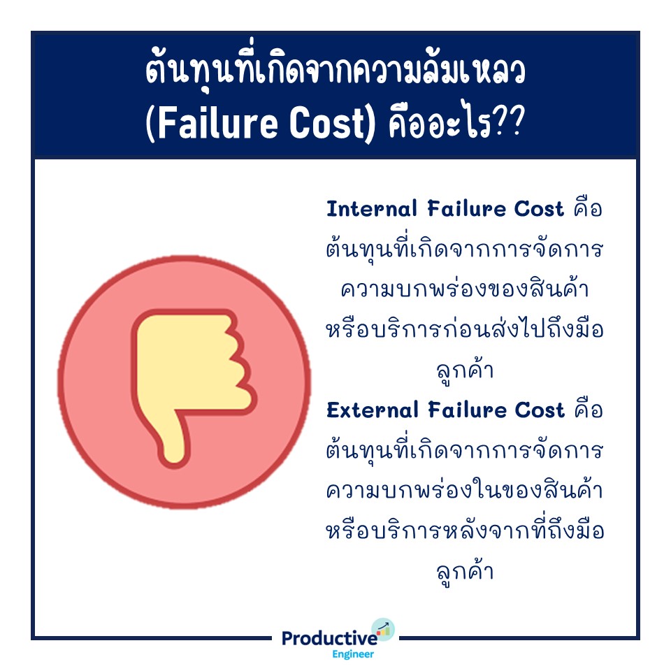 • Internal failure cost – ต้นทุนความเสียหายภายในคือต้นทุนที่เกิดจากการจัดการความบกพร่องของสินค้าหรือบริการก่อนส่งไปถึงมือลูกค้า
