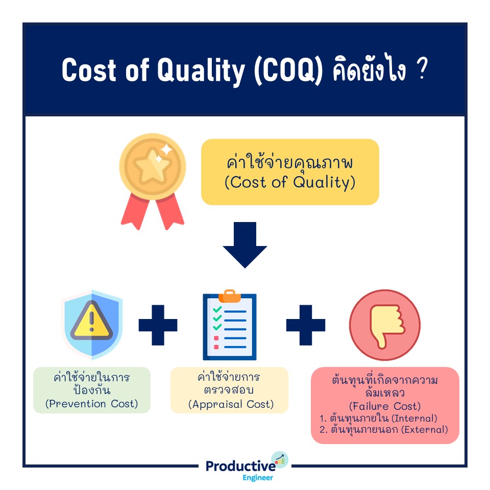 📌Cost of Quality (COQ) คือ ผลรวมทั้งหมดของค่าใช้จ่ายในการป้องกัน (Prevention Cost), ค่าใช้จ่ายการตรวจสอบ (Appraisal Cost) และต้นทุนที่เกิดจากความล้มเหลว (Failure Cost)