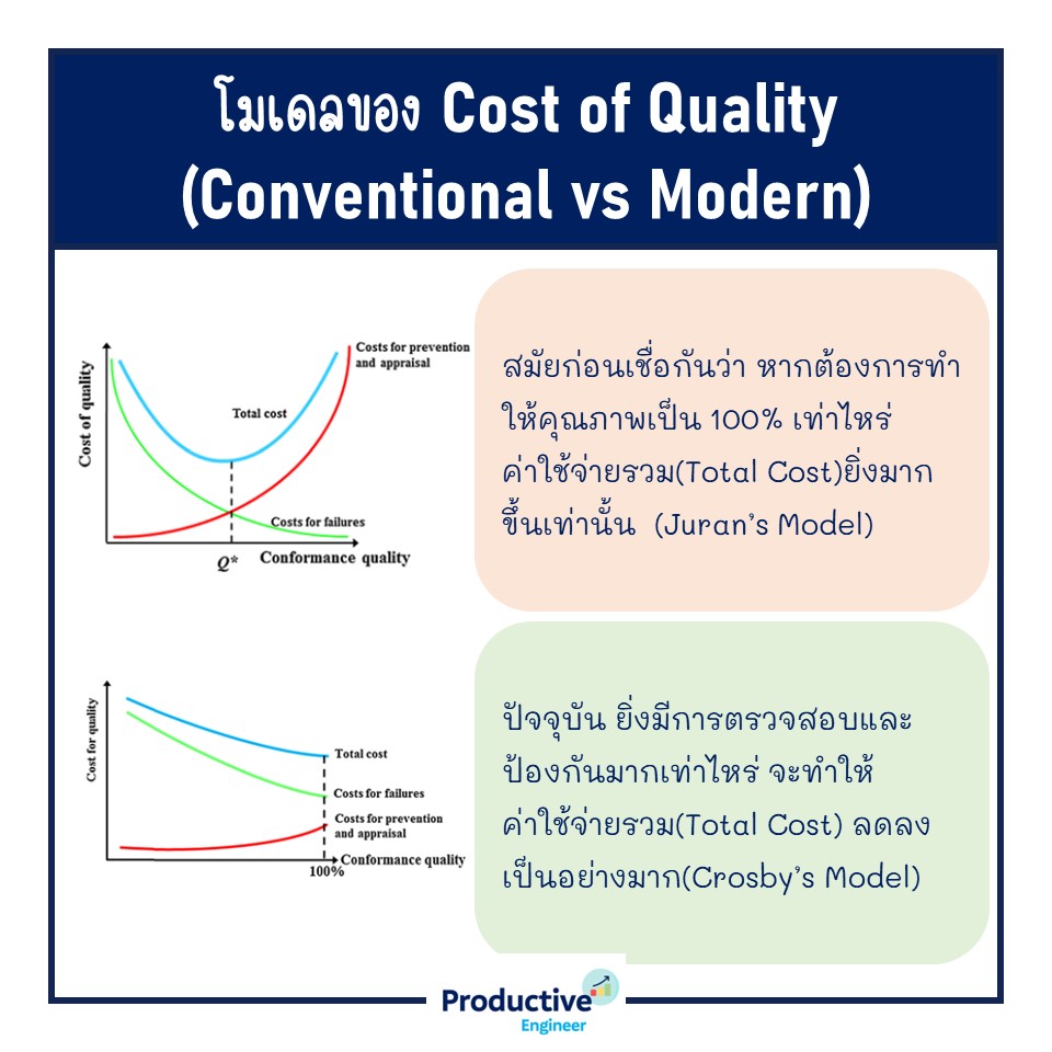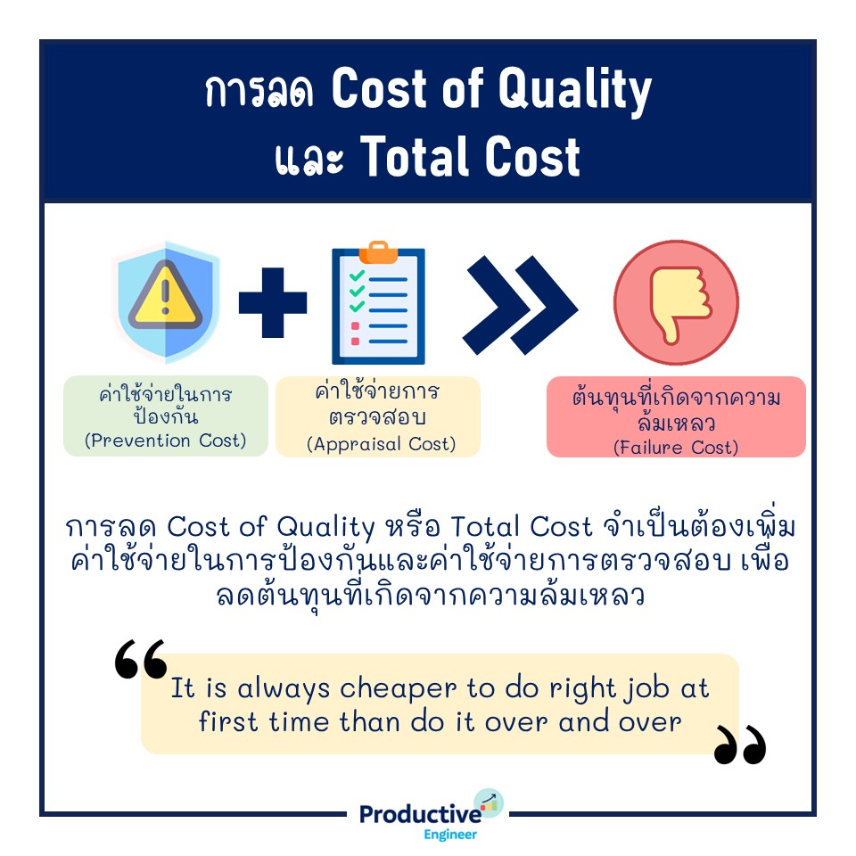 📌หลักการการลด Cost of Quality และ Total Cost คือการต้นลงทุนเพื่อเพิ่ม Conformance Cost ได้แก่ค่าใช้จ่ายในการป้องกันและการตรวจสอบ เพื่อลด Non-Conformance Cost ได้แก่ต้นทุนที่เกิดจากความล้มเหลว ยิ่งเราสามารถป้องกันหรือตรวจสอบคุณภาพของสินค้าก่อนไปถึงลูกค้าได้ดีเท่าไหร่ ยิ่งทำให้ต้นทุนรวมต่ำลงเท่านั้น ตามทำกล่าวที่ว่า “ทำงานให้ถูกต้องแต่ครั้งแรกไปเลย ดีกว่าเสียเวลานำงานกลับมาแก้ไข” เพราะท้ายสุด ถ้านำงานหรือสินค้ากลับมาแก้ไขแล้ว ผลเสียอาจจะไม่ได้มีแค่ค่าใช้จ่ายเท่านั้น อาจจะมีในเรื่องของภาพลักษณ์ของสินค้า องค์กร ค่าปรับ หรืออื่นๆที่เราอาจจะมองไม่เห็นก็เป็นได้