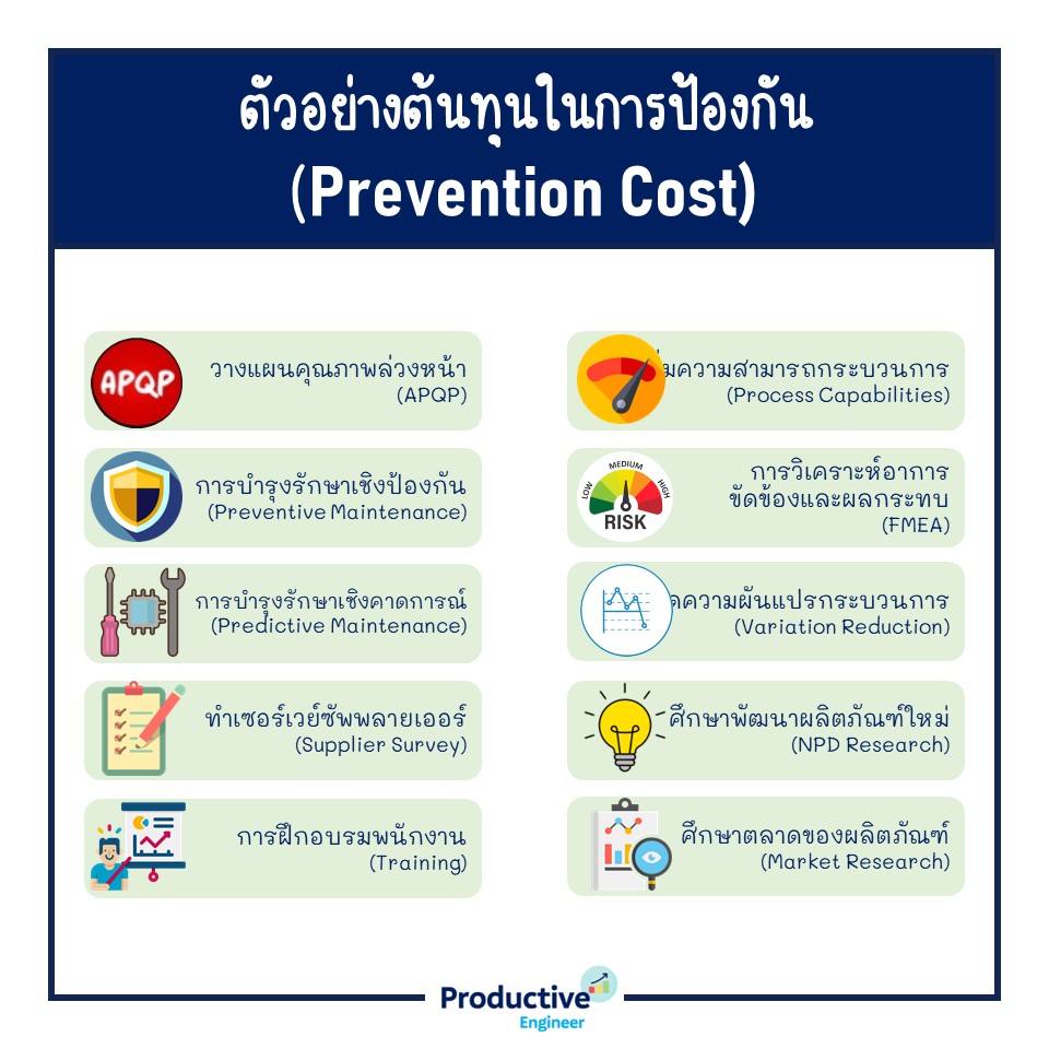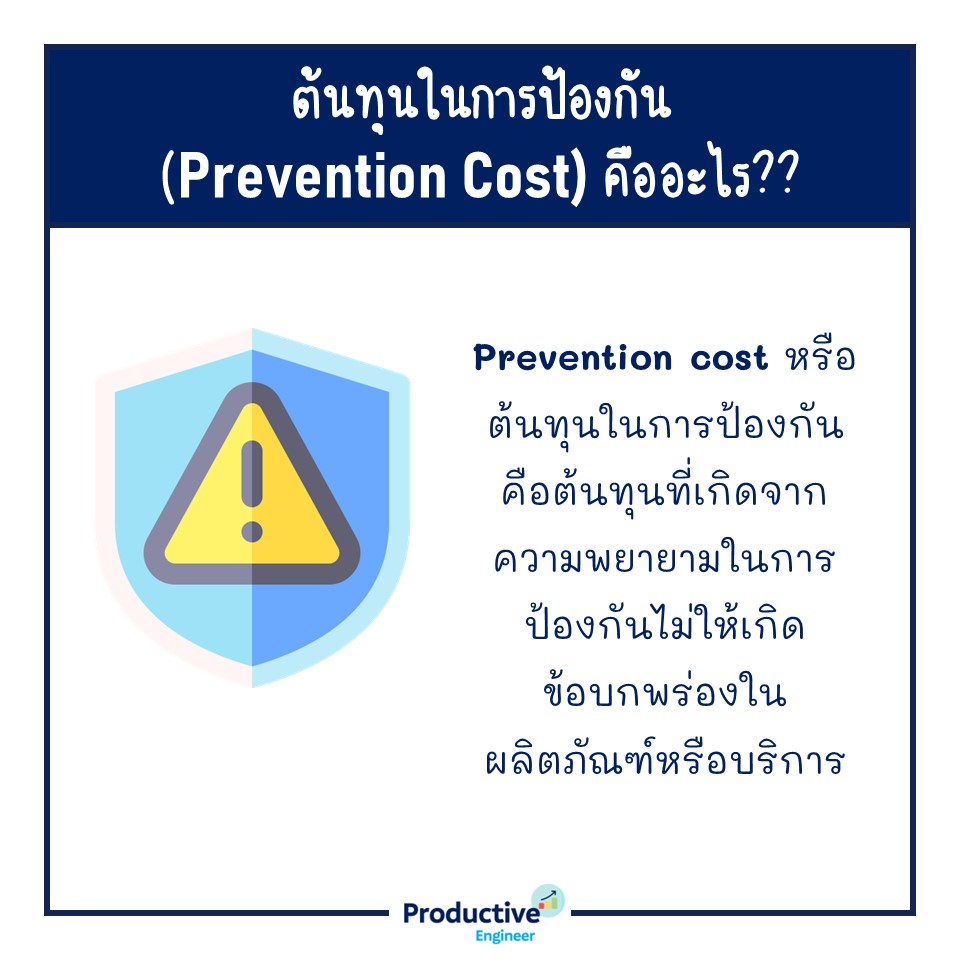 • Prevention cost –ต้นทุนในการป้องกันคือต้นทุนที่เกิดจากความพยายามในการป้องกันไม่ให้เกิดข้อบกพร่องในผลิตภัณฑ์หรือบริการ
