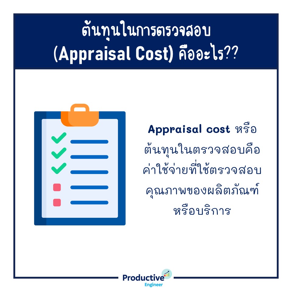 • Appraisal cost – ต้นทุนในการตรวจสอบคุณภาพสินค้าคือค่าใช้จ่ายที่ใช้ตรวจสอบคุณภาพของผลิตภัณฑ์หรือบริการ