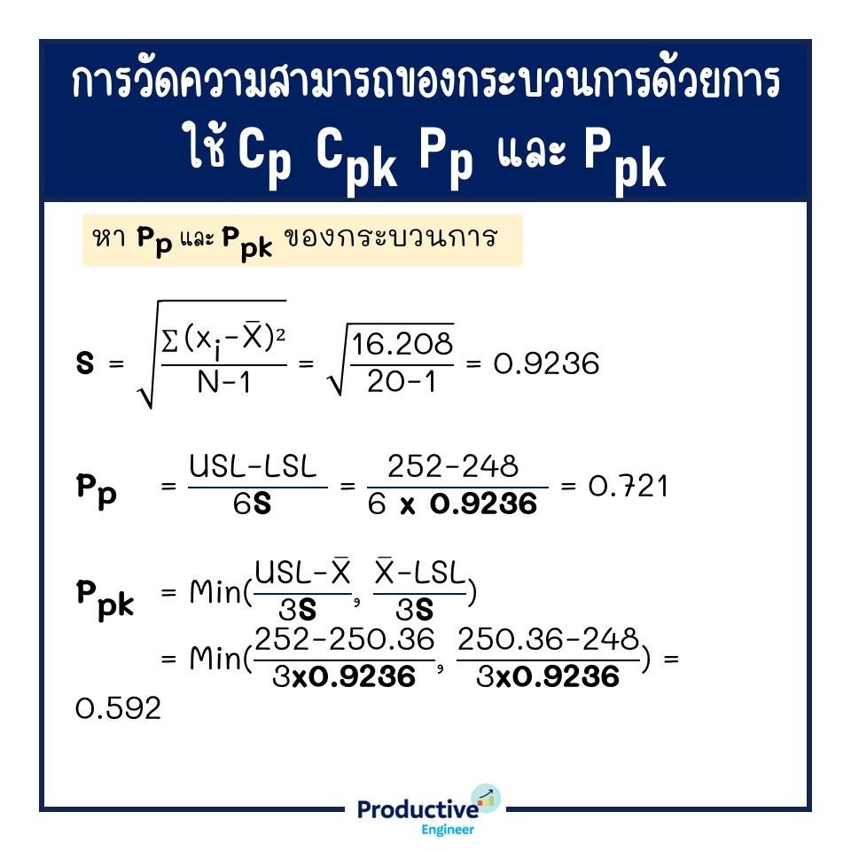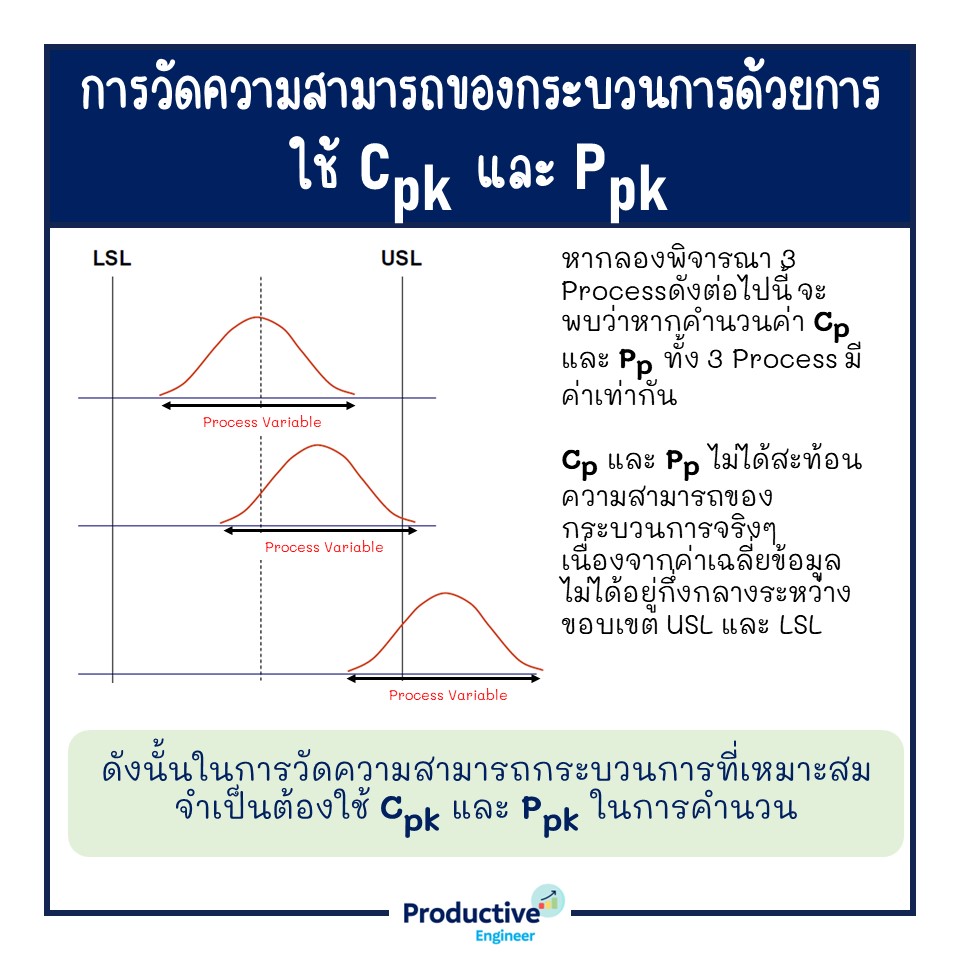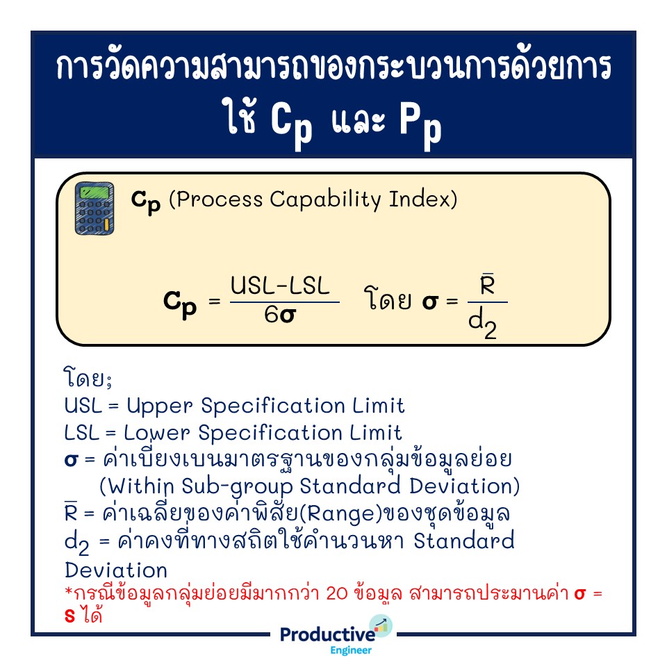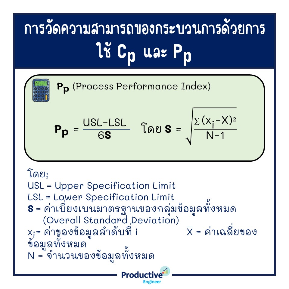 โดยค่าที่จะใช้ในการวัดความสามารถกระบวนการว่ากระบวนการไหนมีประสิทธิภาพไม่มีประสิทธิภาพคือ Cp และ Pp