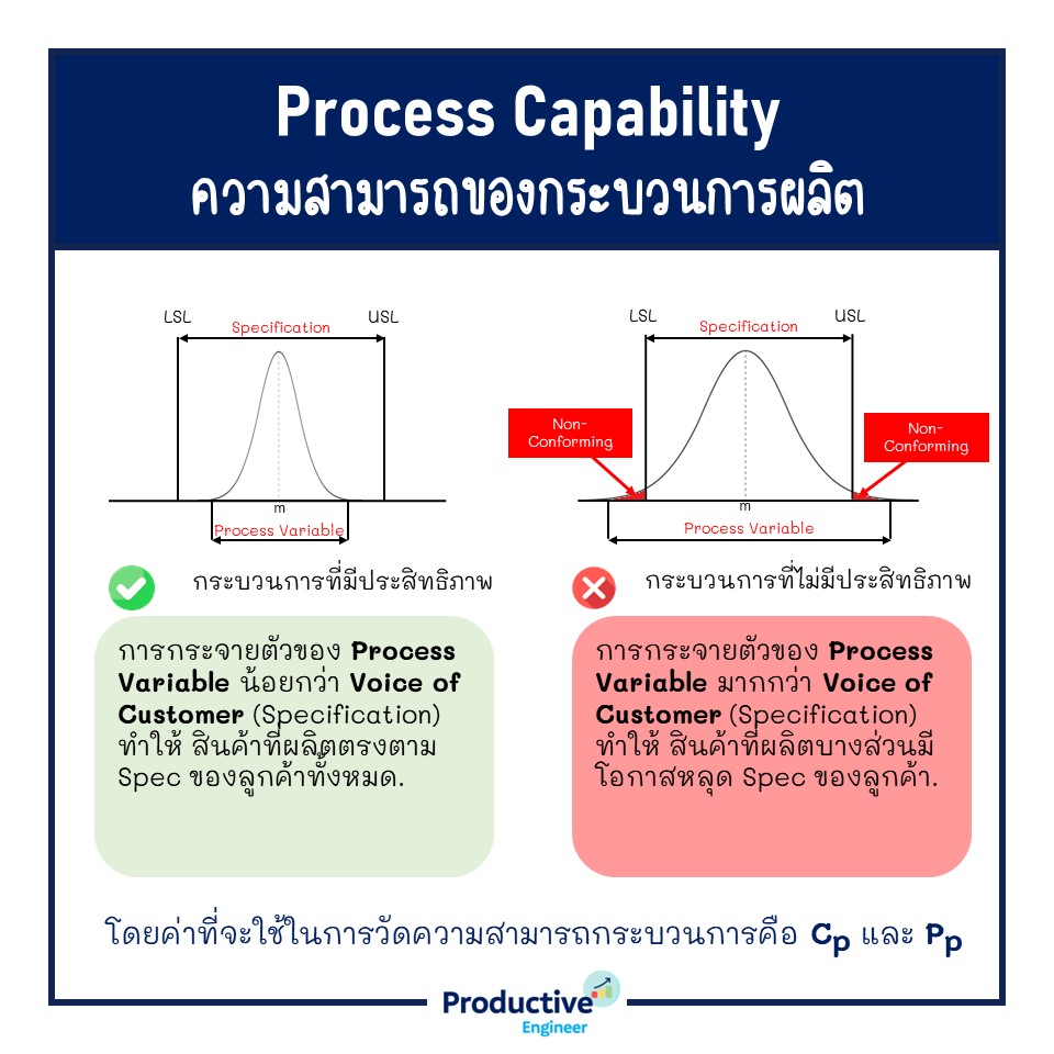 Process Capability คือการวัดความสามารถของกระบวนการผลิตในการผลิตสินค้าว่าสามารถผลิตสินค้าที่ตรงตามมาตรฐานและมีคุณภาพสูงได้หรือไม่ โดยปกติแล้วการวัดความสามารถของกระบวนการผลิตจะทำการเทียบ Process Variation (ค่าผันแปรของกระบวนการ) กับ Voice of Customer หรือ Customer Specification (ค่าความต้องการของลูกค้า)